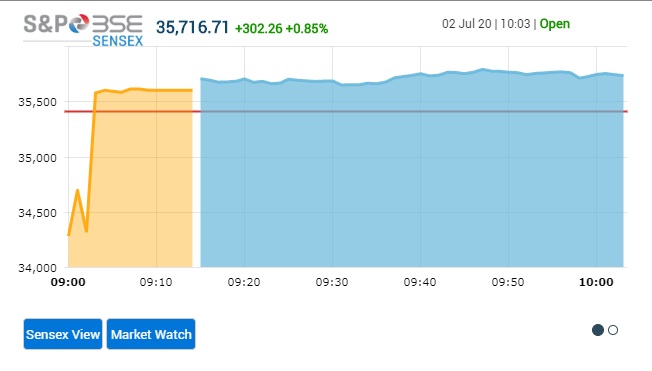 10.03 AM: बीएसई 302.26 अंकों की तेजी के साथ 35,716.71 पर, निफ्टी 87.85 पॉइंट की तेजी के साथ 10,517.90 पर कारोबार कर रहे हैं।